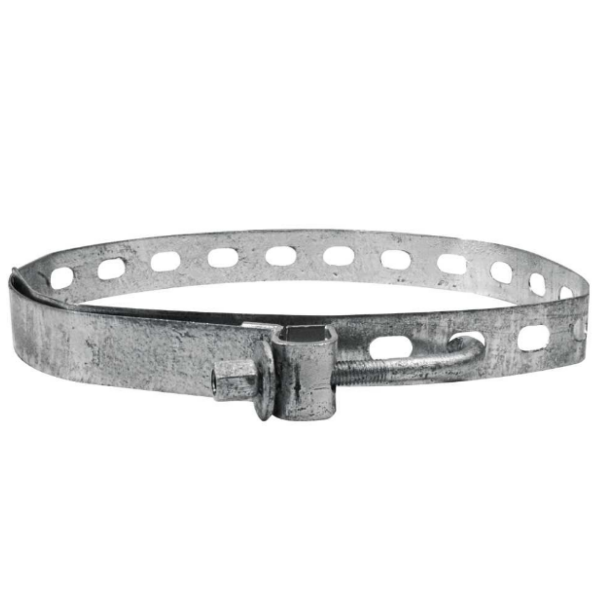 BAP 4 – A Braçadeira BAP 4 para poste da Next Metais é composta de cinta de aço ajustável de 1000mm, parafuso ajustador, porca e arruela (todos galvanizados à fogo).