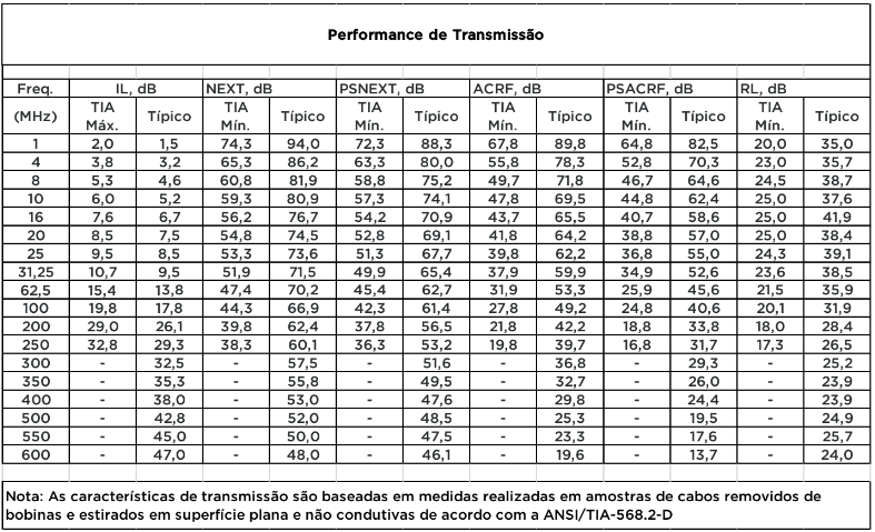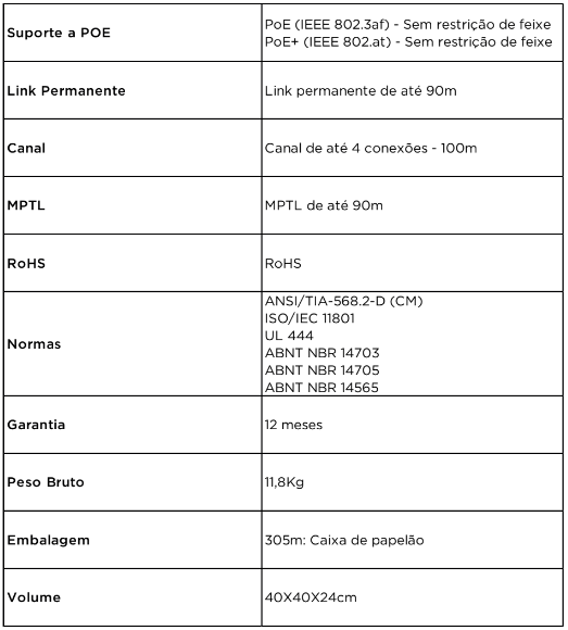 APLICAÇÃO: Suporta: GIGABIT ETHERNET, IEEE 802.3ab; 1000 baseT, IEEE 802.3an; 100BASE-TX, IEEE 802.3u; 100BASE-T4, IEEE 802.3u; 100vg-AnyLAN, IEEE802.12; ATM -155 (UTP); AF-PHY-OO15.000; AF-PHY-0018.000; TP-PMD, ANSI X3T9.5; 10BASE-T, IEEE802.3; TOKEN RING, IEEE802.5; 3X-AS400, IBM; TSB-155; ATM LAN 1.2 Gbit/s, AF-PHY 0162.000 2001; NEC Artigo 800.