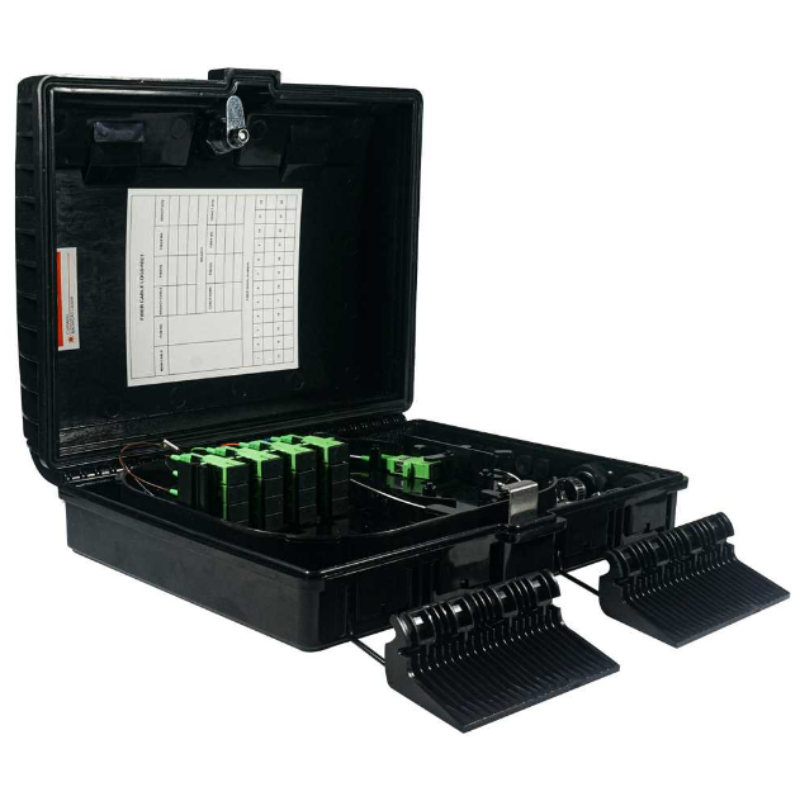 Ela é otimizada para ambientes aéreos externos, contando em isolação de qualidade e proteção UV. Acompanha uma bandeja para acomodação de splitter óptico ou emenda de fibra óptica, com função de distribuir o sinal de fibra óptica em 8 saidas (1x8) APC